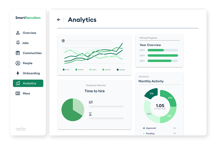 Mit SmartAnalytics verfolgst du alle relevanten Recruiting-Kennzahlen und passt Dashboards individuell an die Prioritäten deines Unternehmens an. Häufig genutzte Kennzahlen sind Zeit bis zur Einstellung, Zeit bis zum Interview, Herkunft der Bewerber:innen, Ablehnungsquoten und Annahmeraten von Angeboten.