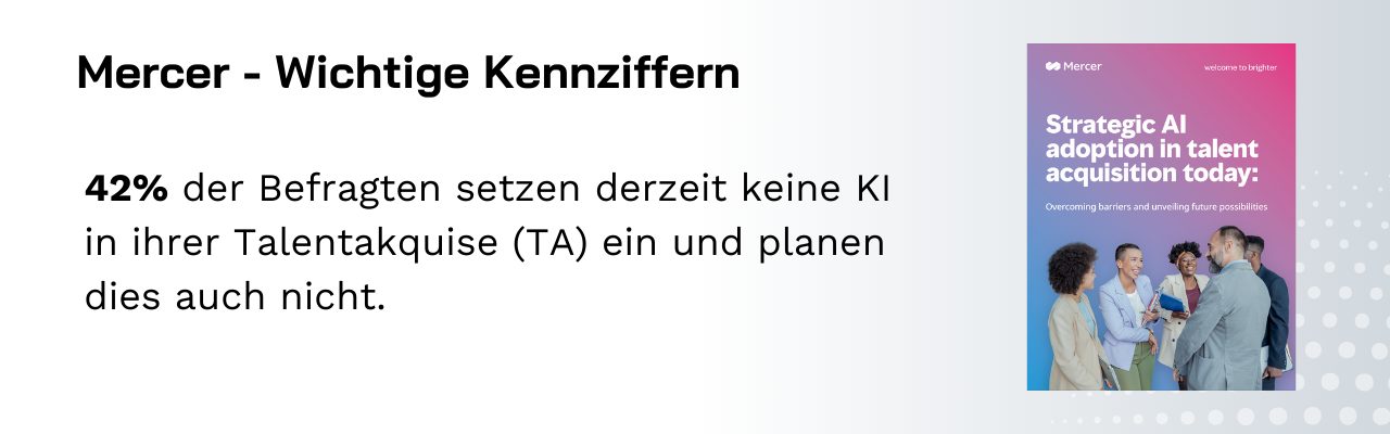 Mercer ist ein professionelles Dienstleistungsunternehmen, das zu mitarbeiterbezogenen Themen wie Talentmanagement, Pensionierung, Transformation sowie Fusionen und Übernahmen berät. Im Februar 2024 wurde der Bericht Strategischer Einsatz von KI in der Talentakquise (TA) heutzutage: Hindernisse überwinden und zukünftige Möglichkeiten aufzeigen veröffentlicht. Mercer befragte dazu 477 HR- und TA-Führungskräfte aus verschiedenen Branchen. Die Autoren des Berichts fassen die Ergebnisse folgendermaßen zusammen: