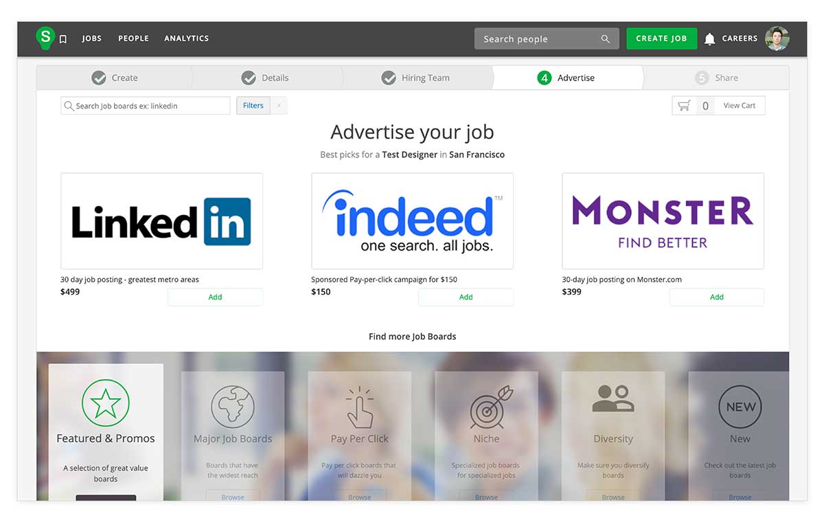 Comme d’autres solutions logicielles de publication et de gestion des offres d’emploi, SmartJobs prélève un pourcentage (%) de frais de gestion sur votre budget d’annonces en ligne. Aucun coût caché ni budget supplémentaire n’est requis.